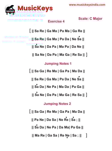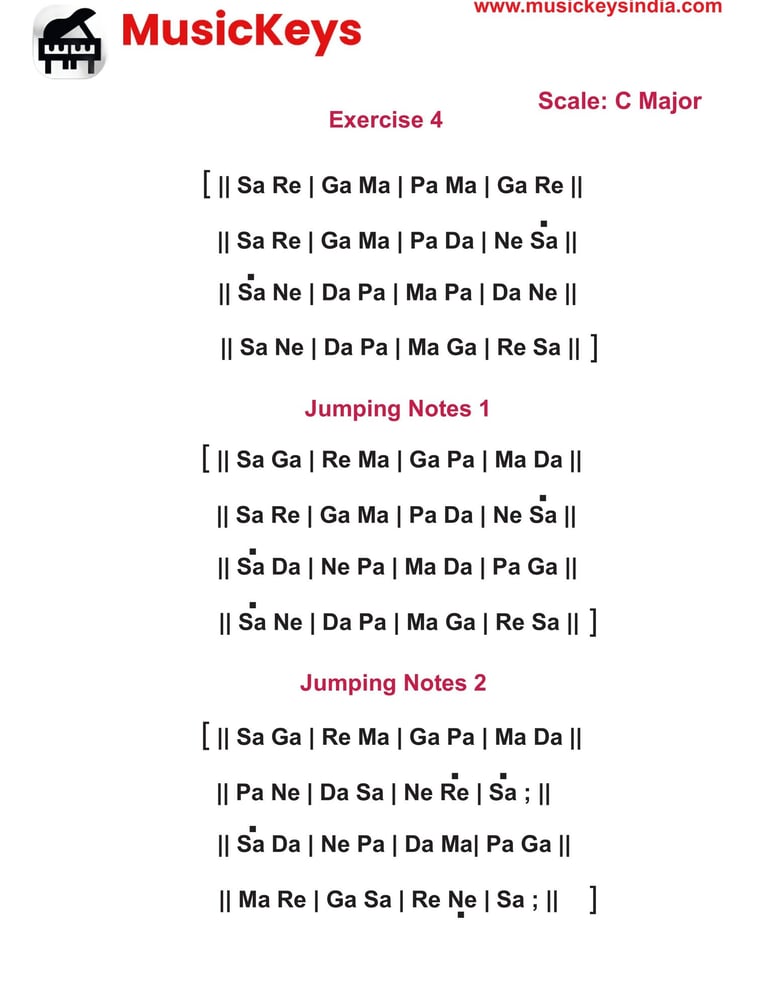 Here are more basic keyboard-fingering exercises. Note that it is on the C Major Scale. Take one exercise at a time, as there is a combination of notes. The first step is to study the sequence. Take up the first line. Play it a few times. Try to sing the notes. After some practice, try not to see the notes and play. You should be in a position to play. Once you have learned the first line, go to the second line. Follow the same process as you knew the first. After learning the second line, try to play the first and second lines and see if you can play them without looking at the notes. Follow the same practice technique. You should be in position for the whole exercise. Similarly, play up all three exercises. When you finish all the piano exercises, you will be more confident about the piano keys and the position of musical notes.